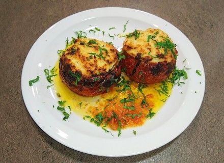 11. Όταν ψηθούν οι ντομάτες και τις βγάλουμε από τον φούρνο, αφαιρούμε τα "καπάκια" τους και βάζουμε επάνω στην καθεμιά λίγη από την μπεσαμέλ που ετοιμάσαμε.