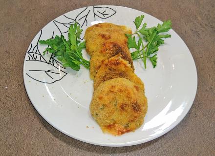 Με δύο κουτάλια φτιάχνουμε τις κροκέτες, που στην κάθε μία εγκλωβίζουμε ένα κομματάκι τυρί. Την κάθε κροκέτα τη ρίχνουμε στην τριμμένη φρυγανιά και τις τοποθετούμε σε ταψί πάνω σε λαδόκολλα. Αφού τις φτιάξουμε όλες ρίχνουμε, όπως είναι στο ταψί τοποθετημένες, ελαιόλαδο και τις ψήνουμε σε προθερμασμένο φούρνο με αέρα στους 200 ℃. Όταν πάρουν χρώμα είναι έτοιμες.