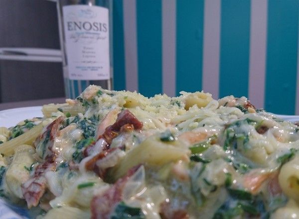 Πένες ριγέ με σολομό, σπανάκι και άρωμα μαστίχας