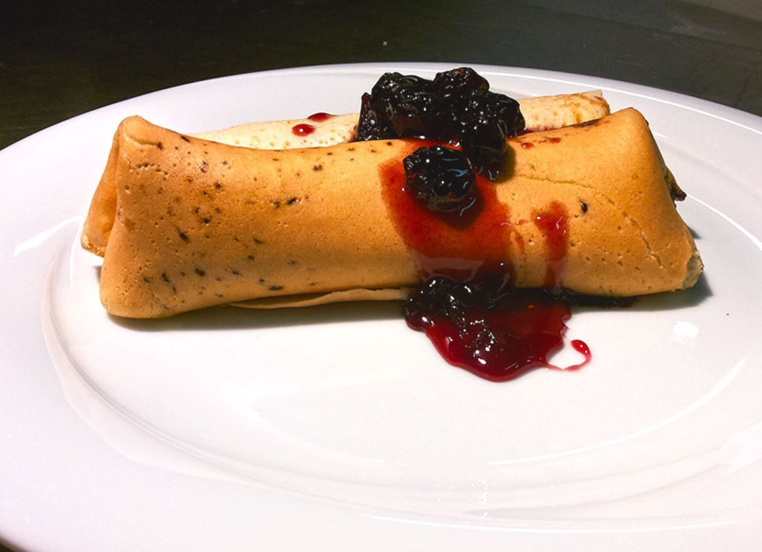 Κρέπες γεμιστές με επάλειμμα χαρουπιού και φουντουκιού σερβιρισμένες με καραμελώμενο κράμπ