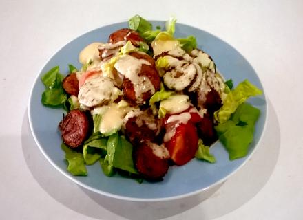 Ανάμεικτη σαλάτα με ψητό λουκάνικο και βινεγκρέτ από Κατίκι Δομοκού