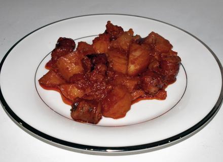 Κρητικό λουκάνικο με πατάτες γιαχνί και κόκκινο κρασί
