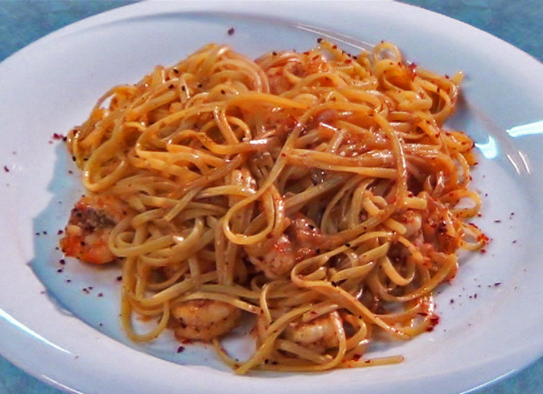 Λινγκουίνι με γαρίδες μαριναρισμένες με σουσάμι, σουμάκ, ούζο και μέλι.