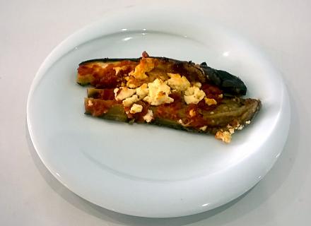 Αφήνουμε να βράσουν για δέκα λεπτά και περιχύνουμε τις μελιτζάνες. Τρίβουμε την φέτα από πάνω και φουρνίζουμε για 20 λεπτά στους 200οC.