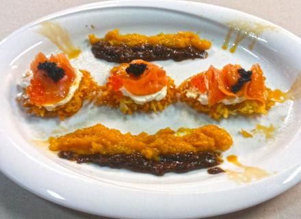 Βάζουμε τα 150 ml λευκό κρασί μαζί με τα δαμάσκηνα να βράσουν. Αφού βράσουν τα πολτοποιούμε στο μπλέντερ και επαναλαμβάνουμε τη διαδικασία για τα βερύκοκα. Στη συνέχεια τρίβουμε τις πατάτες με τη χοντρή πλευρά του τρίφτη, τις αρωματίζουμε κατά προτίμηση και τις τηγανίζουμε φτιάχνοντας στρογγυλές βάσεις. Μόλις τηγανιστούν αποσύρουμε από τη φωτιά και τις αφήνουμε να κρυώσουν. Αλείφουμε με το τυρί Φιλαδέλφεια και γαρνίρουμε με το σολομό, το μπρι και το χαβιάρι. Σερβίρουμε στο πιάτο μας προσθέτοντας τις σάλτσες των φρούτων που φτιάξαμε και ψεκάζοντας με το λάδι από τσίλι.