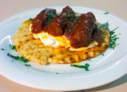Βάζουμε το ελαιόλαδο να κάψει τηγανίζουμε τις πίτες μας αλευρώνουμε τα σουτζουκάκια τα τηγανίζουμε τα βγάζουμε και βάζουμε στο τηγάνι το κρεμμύδι το σκόρδο κ αφότου σατιριστούν το πελτέ της ντομάτας ξαναπροσθέτουμε τα σουτζουκάκια σβήνουμε με κόκκινο κρασί αρωματίζουμε με τα μπαχαρικά μας και το αφήνουμε να βράσει για ένα τέταρτο περίπου μόλις ψηθούν τα σουτζουκάκια και δέσει η σάλτσα το φαγητό μας είναι έτοιμο σερβίρουμε βάζοντας ως βάση τις πίτες που έχουμε τηγανίσει κομμένες επάνω το γιαούρτι και από πάνω τα σουτζουκάκια.