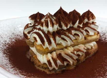Χτυπάμε σε μπεν μαρι τη ζάχαρη άχνη με τους κρόκους αυγών μέχρι να γίνει μια πλούσια κρέμα και να φτάσει στους 82 βαθμούς Κελσίου ώστε να παστεριωθεί το αυγό, μόλις κρυώσει λίγο, προσθέτουμε το χτυπημένο μασκαρπόνε (το έχουμε ήδη χτυπήσει στο μίξερ). Σε μια μπασίνα χτυπάμε τα ασπράδια μέχρι να γίνουν μαρέγκα και με λίγο νερό βράζουμε τα 50 γρ. ζάχαρης μέχρι να λιώσει, καθώς χτυπιέται η μαρέγκα προσθέτουμε μέσα στη μαρέγκα λίγο λίγο το σιρόπι που φτιάξαμε. Ενσωματώνουμε τα δυο μίγματα, αρωματίζουμε με το λικέρ μαστίχας Χίου Ψυχής, το μπράντι και το Μαρσάλα. Σε ένα μπολ, βάζουμε το γάλα και τον καφέ και βρέχουμε τα σαβαγιάρ, στρώνουμε σε ένα σκεύος μια σειρά σαβαγιαρ, λίγη κρέμα και πασπαλίζουμε με το κακάο. Τοποθετούμε στο ψυγείο μέχρι να σφίξει. Αν θέλουμε σερβίρουμε και αμέσως σε πιάτο διακοσμώντας κατά προτίμηση.