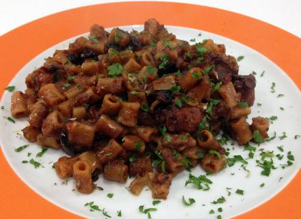 Πλένω καλά το χταπόδι και το κόβω σε κομμάτια. Σοτάρω στο ελαιόλαδο τα κρεμμύδια και το σκόρδο ελαφρά και βάζω μέσα το χταπόδι να βγάλει τα υγρά του. Προσοχή: Δεν προσθέτω καθόλου νερό σε αυτό το σημείο γιατί το χταπόδι θα σφίξει, θα σκληρύνει.
