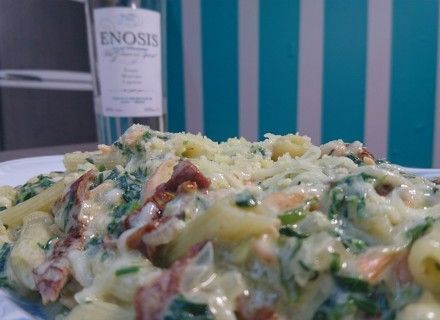 Τοποθετούμε τα μακαρόνια σε μια κατσαρόλα με βραστό νερό. Ψιλοκόβουμε το κρεμμύδι και το τζίντζερ και τα σοτάρουμε στο τηγάνι. Κόβουμε το σπανάκι και το τοποθετούμε και αυτό στο τηγάνι ώσπου να σοταριστεί και αυτό. Προσθέτουμε άνηθο και μαϊντανό το ψιλοκομμένο σχινόπρασο και λιαστές ντομάτες. Στο τέλος προσθέτουμε και τον σολομό κομμένο σε μεγάλα κομμάτια. Τελειώνουμε την σάλτσα μας με λικέρ μαστίχα και κρέμα γάλακτος. Μόλις έχουν μαλακώσει τα λαχανικά και ο σολομός προσθέτουμε το μίγμα τυριών.