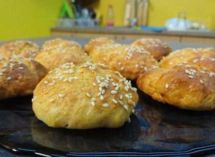 Με τα χέρια φτιάχνουμε οβάλ μπισκοτάκια (όχι πολύ λεπτά) που τα τοποθετούμε σε αντικολλητικό χαρτί. Τα αλείφουμε με τον κρόκο αβγού, πασπαλίζουμε με σουσάμι και τα ψήνουμε σε αερόθερμο φούρνο στους 160ο για 15 με 20 λεπτά.